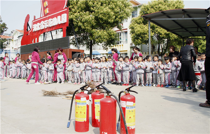 聽了消防知識的講解,體驗了正確逃離火災(zāi)的流程,接下來,就是看消防員叔叔們怎樣滅火了。現(xiàn)場,堆著木板的鐵桶被點燃,消防員叔叔拿著滅火器以正常速度演示滅火過程,又步步分解使用滅火器的要點“一提二拔三對準(zhǔn)”。看著一陣陣白色粉末從紅色的瓶子里噴出,并迅速熄滅火堆,孩子們興奮不已、躍躍欲試。在老師的陪伴下,有幾名小朋友體驗了滅火的過程。