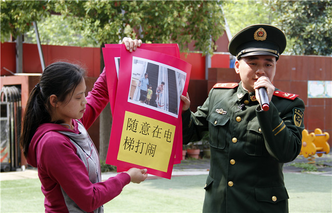 除了火災(zāi),電梯、防盜窗等日常小朋友經(jīng)常接觸的地方,也是消防事故的常發(fā)點。為了讓小朋友牢記相關(guān)的注意事項,消防員叔叔拿著印有各種消防事故畫面的泡沫板,一遍遍提醒孩子們?nèi)绾伪苊膺@些消防情況的發(fā)生。