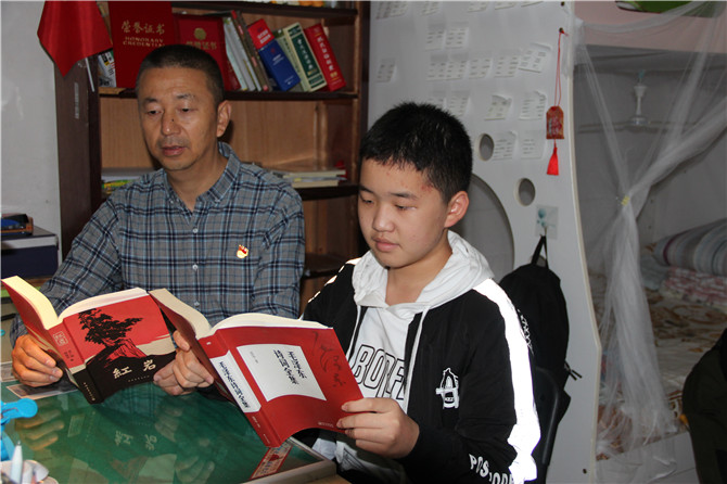 11月10日晚,在仙桃二中錢溝路校區八(24)班的學生馬明昊家中,他正在閱讀革命經典著作《紅巖》,他的父親馬濤也捧著一本黨史著作陪伴他。