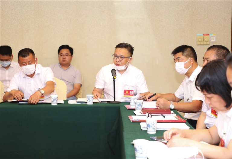 昨日下午,出席市九屆人大五次會議的代表進行分團審議,代表們圍繞非織造布特色小鎮建設、擦亮小城鎮暨美麗鄉村建設、脫貧攻堅等工作各抒己見,為推動仙桃經濟社會高質量發展建言獻策。圖為代表們在審議中。(攝影 記者 劉賢雙)