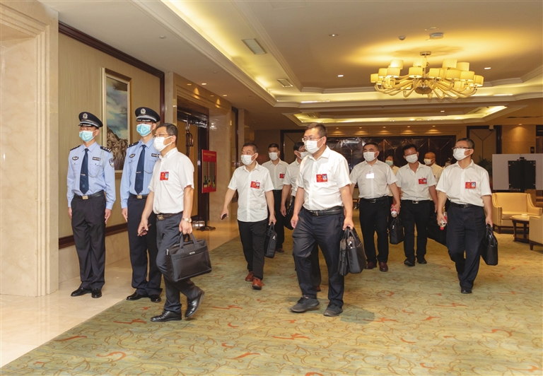 昨日,市政協九屆四次會議隆重開幕,全市廣大政協委員聚集一堂,為決戰決勝全面建成小康社會、打贏脫貧攻堅戰,為實現仙桃高質量發展建言獻策。圖為委員們步入會場。(攝影記者  鄭恒)